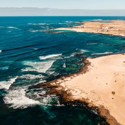 - Fuerteventura is only 100 km away from Africa. Due to its proximity, the wind often blows Saharan sand onto the island, forming the Parque Natural de Corralejo, one of the most beautiful beaches in Fuerteventura. On Fuerteventura you will not only find kilometers of white sandy beaches, but also unusual black beaches made of volcanic rock. With a boat trip on a pirate ship, a trip on a catamaran or on a sailing boat, you can admire the coast of Fuerteventura from the sea, relax and, with a bit of luck, even see whales or dolphins. In Fuerteventura you should definitely stop by the fishing village of Morro Jable; there are restaurants that serve delicious, fresh fish dishes.