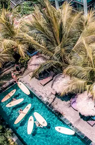 Even for a small budget there are beautiful accommodations in Bali - without sacrificing comfort. In this surf camp you live directly on the beach or near the beach, you can hang out at the pool after the surf session and you get a fantastic holiday in paradise at the best price-performance ratio.