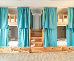 The 4-Bed dorm at Beachfront Surf Camp is perfect for friends or solo travelers on a surf trip. Equipped with 2 bunk beds and shelves there is enough space for your luggage. The 4-bed room can be booked exclusively or as a shared room.