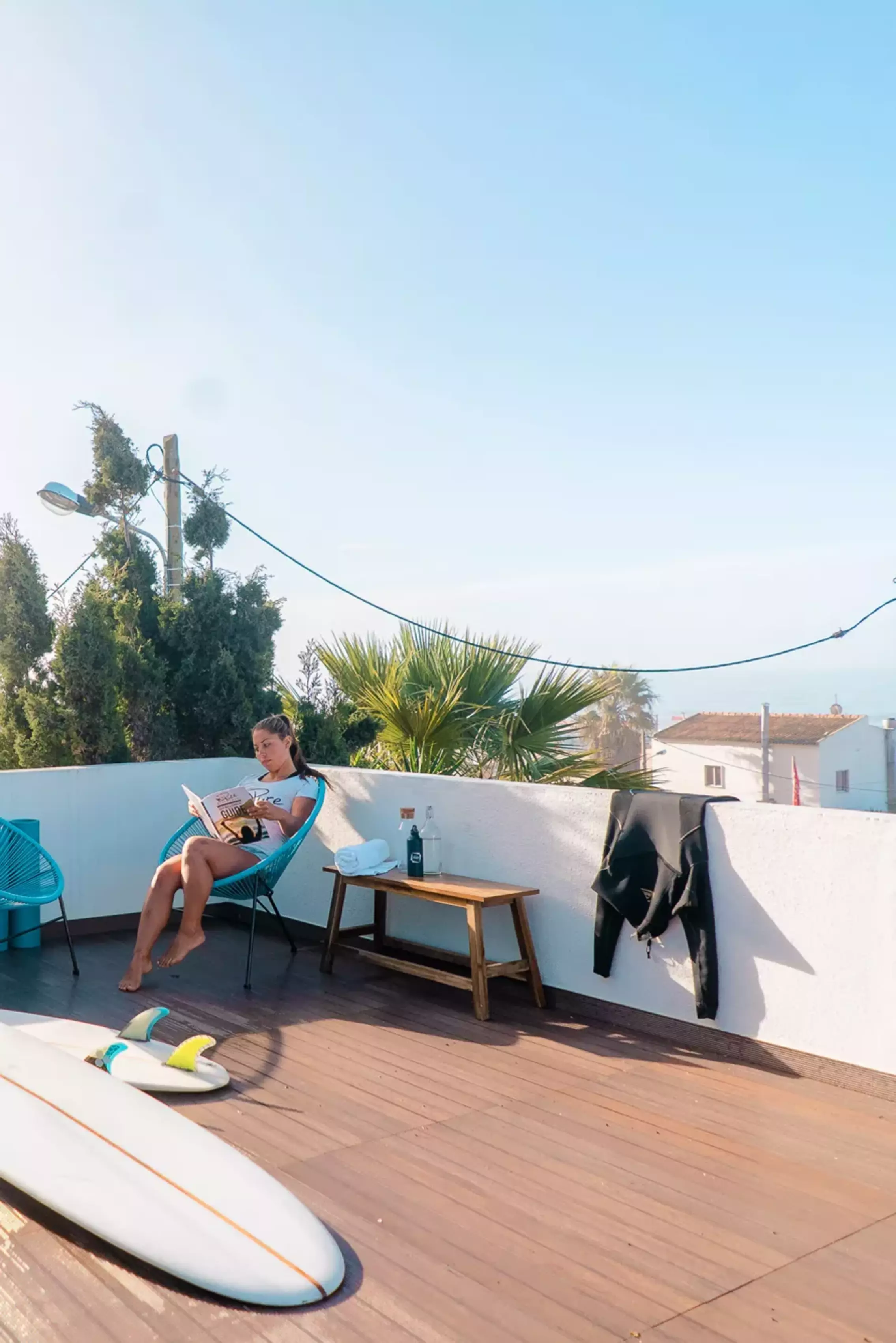 The Beachfront Surf Camp Caparica has a large living room with a TV and comfortable sofas. This is also where we have breakfast together. Outside you can of course make yourself comfortable on the spacious sun terrace from which you can see the sea and check out the waves.