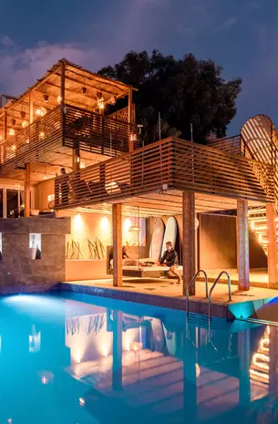 Pure Surf Camps offers trips to Surf Lodge Portugal in the Algarve, which includes stunning ocean views from your room and the terraced rooftop swimming pool. The lodge lies at the foot of a nature reserve so when you are not looking at the ocean, you can stare into the untouched nature of the Algarve. Ingrina and Zavial beaches are 10 minutes away on foot and work best on a south swell. When you aren’t surfing the beaches are a great place for swimming, relaxing, and soaking up the sun. To the Surf Lodge! The surf lodge boasts a huge sun terrace, comfortable sun chairs and an amazing rooftop pool. All the rooms have a private bathroom and come with comfortable furniture. There is a big communal living room with a fireplace and dining area where you’ll get amazing breakfasts and dinner. In the lush green garden area at the lodge you'll find hammocks making it the perfect place to chill in the shade after your surf. And when the sun starts to get lower you can go to the in-house bar and get yourself the surf camp special, a “Spicy Sven” or any other cocktail to cheers with. The surf course takes place at a local beach break that has great conditions for beginners and intermediate surfers and happens 5 times a week, with a 1.5-hour session in the morning, and the same again in the evening. You’ll get picked up in the morning and taken to the beach and all equipment is included. If you’re after another way to tire yourself out for the evening, Stand Up Paddleboard tours are also available and will guide you around the coast to some hidden beaches, and the option to jump of some cliffs into the water. Twice a week, sunrise yoga takes place on the rooftop terrace for your pre surf warm up. And in between surfing you can snorkel and dive at Ingrina Beach. Another highlight is the weekly BBQ where you can try the Lodge delicacy, the homemade burger, which is usually followed by a trip to nearby Sagres to party. If you’re looking for comfortable and modern accommodation in a naturally beautiful location with great surf and an amazing team, Surf Lodge Portugal is the place for you!