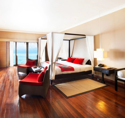 Der mit Holz gestaltete Außenbereich ergänzt den modernen Innenraum. Deine Villa bietet dir Meerblick pur und die Terrassentreppe führt direkt ins kristallklare Wasser. Die Villen sind luxuriös mit Kingsize-Bett, Klimaanlage, Minibar, Satelliten TV, Telefon, Kaffee/Tee, Safe und Internetverbindung ausgestattet.