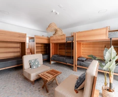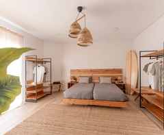 Die gemütliche Lodge verfügt über einen geräumigen Ess- und Wohnbereich, in dem gemeinsam gechillt, gespielt und gemütliche Abende verbracht werden können. Hier findet auch das Frühstück und manchmal das Abendessen statt. Im Garten der Surflodge wartet eine private Poolarea mit Sonnenliegen auf euch.