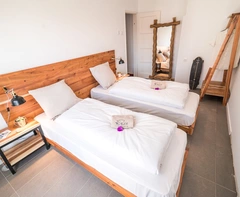 Die gemütlichen und modernen Doppelzimmer sind großzügig geschnitten, mit stylischen Holzmöbeln ausgestattet und verfügen über ein eigenes Bad. Das Bad im stilvollen Design ist mit einer Regendusche und frischen Handtüchern für euch ausgestattet.
