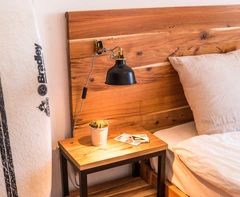 Die gemütlichen und modernen Doppelzimmer sind großzügig geschnitten, mit stylischen Holzmöbeln ausgestattet und teilen sich ein Gemeinschaftsbad. Das Bad im stilvollen Design ist mit einer Regendusche und frischen Handtüchern für euch ausgestattet.