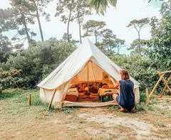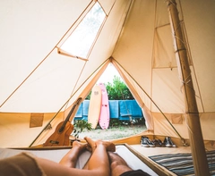 Unsere Tipis sind ein echter Hingucker! Die gemütlichen Unterkünfte haben Fenster zur Belüftung, ein Moskitonetz, Steckdosen und Aufbewahrungsfächer. Mit einer Deckenhöhe von 3 Metern und einer robusten Zeltplane bieten sie viel Platz sowie Schutz vor Wind und Wetter. Jedes unserer Tipis verfügt außerdem über eine kleine Veranda sowie Stauraum für Deine Surfausrüstung unter dem Zelt. Wir stellen Dir eine high-quality Memory-Foam-Matratze zur Verfügung, die antiallergisch, wasserabweisend und super gemütlich ist. Alles was Du mitbringen musst ist ein Kissen, Schlafsack oder Bettzeug.