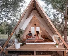 Alle Rundzelte sind ca. 2,5 m hoch und 3,5 m breit. Sie haben eine Mittelstange, Moskitonetze sowie Fenster an der Basis. Zusätzlichen Komfort bieten Bettrahmen, Matratze, Steckdosen und Fairy Lights.